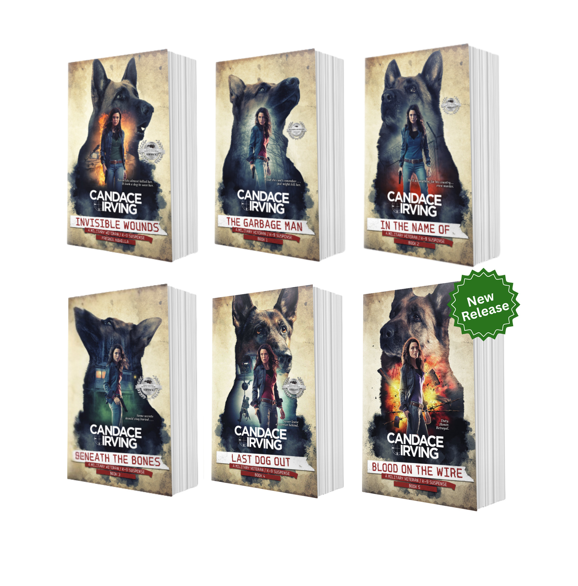 Please Note: There is a dog, but this is not a cozy mystery series. Cursing & gritty, graphic crime scenes abound throughout the Hidden Valor books. This series also contains a raw & honest portrayal of the themes of PTSD & suicide. If you like strong, female protagonists and seriously gritty, complex suspense that twists and turns all the way to The End, you'll love Candace Irving's Hidden Valor series.